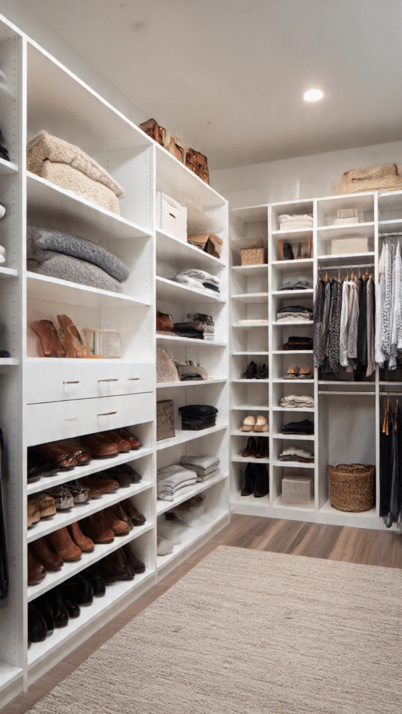 Além disso, aproveite o espaço vertical: prateleiras altas podem armazenar malas, cobertores e roupas de estação, enquanto a parte inferior pode abrigar caixas de sapatos ou cestos.