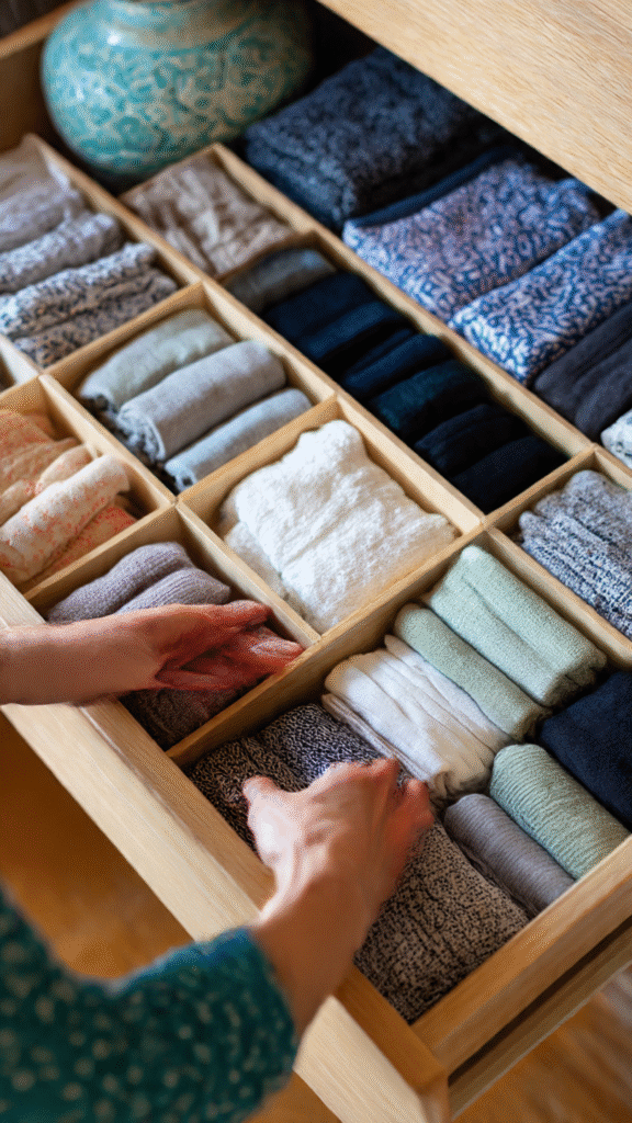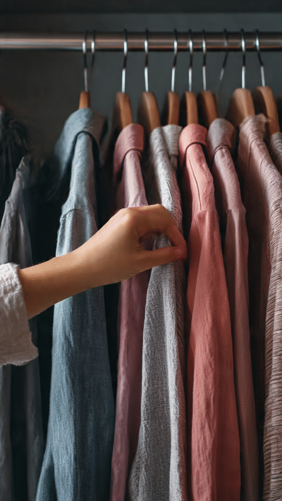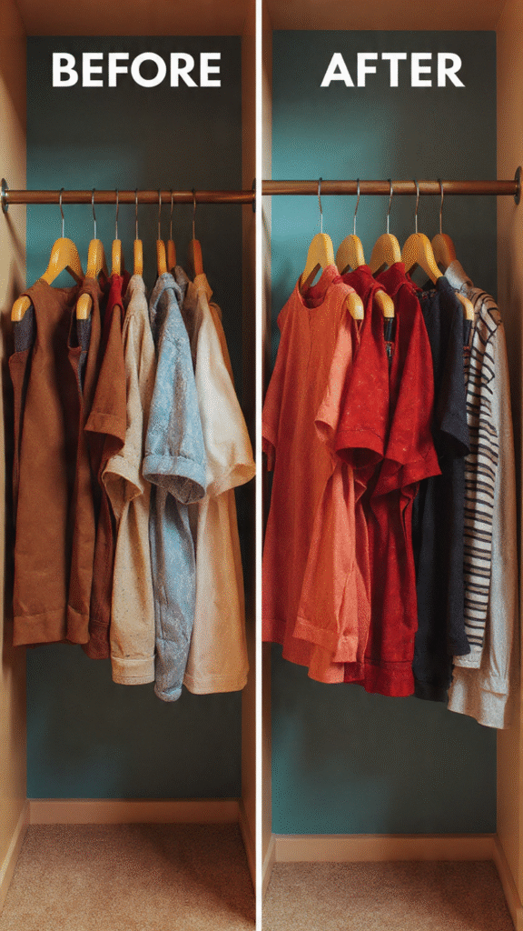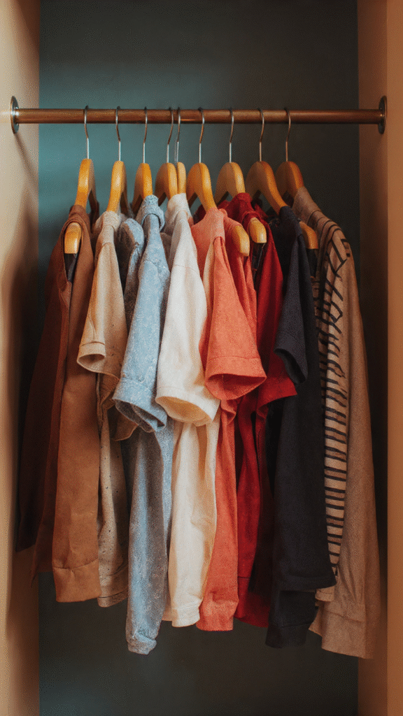 Depois de eliminar o excesso, é hora de categorizar. Separe as roupas por tipo — camisetas, calças, vestidos, casacos, roupas íntimas, etc. Dentro de cada categoria, organize por cor. Essa combinação visual facilita muito na hora de montar looks e mantém tudo com aparência de loja organizada.