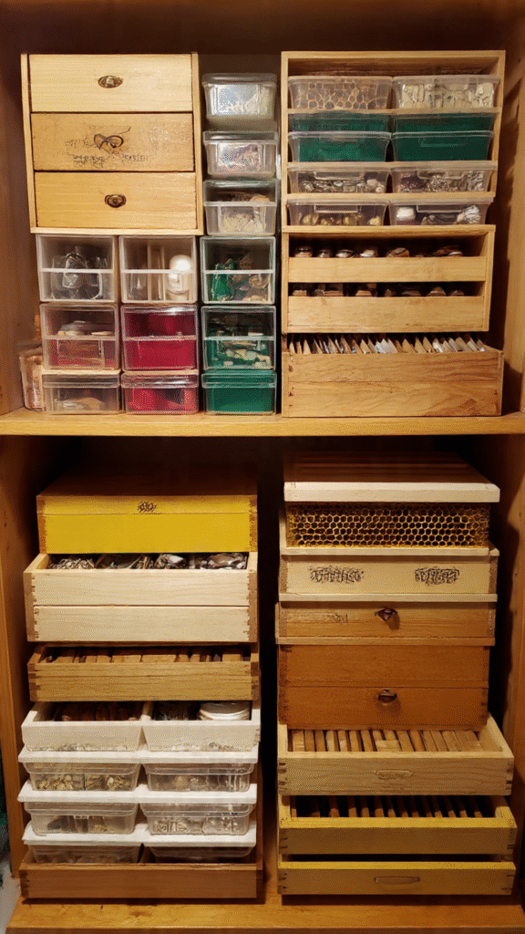 Os organizadores são aliados indispensáveis para manter o guarda-roupa funcional. Caixas, cestos, divisórias e colmeias ajudam a separar peças menores, como meias, roupas íntimas e acessórios. Assim, cada item tem seu lugar e a chance de bagunça diminui drasticamente.